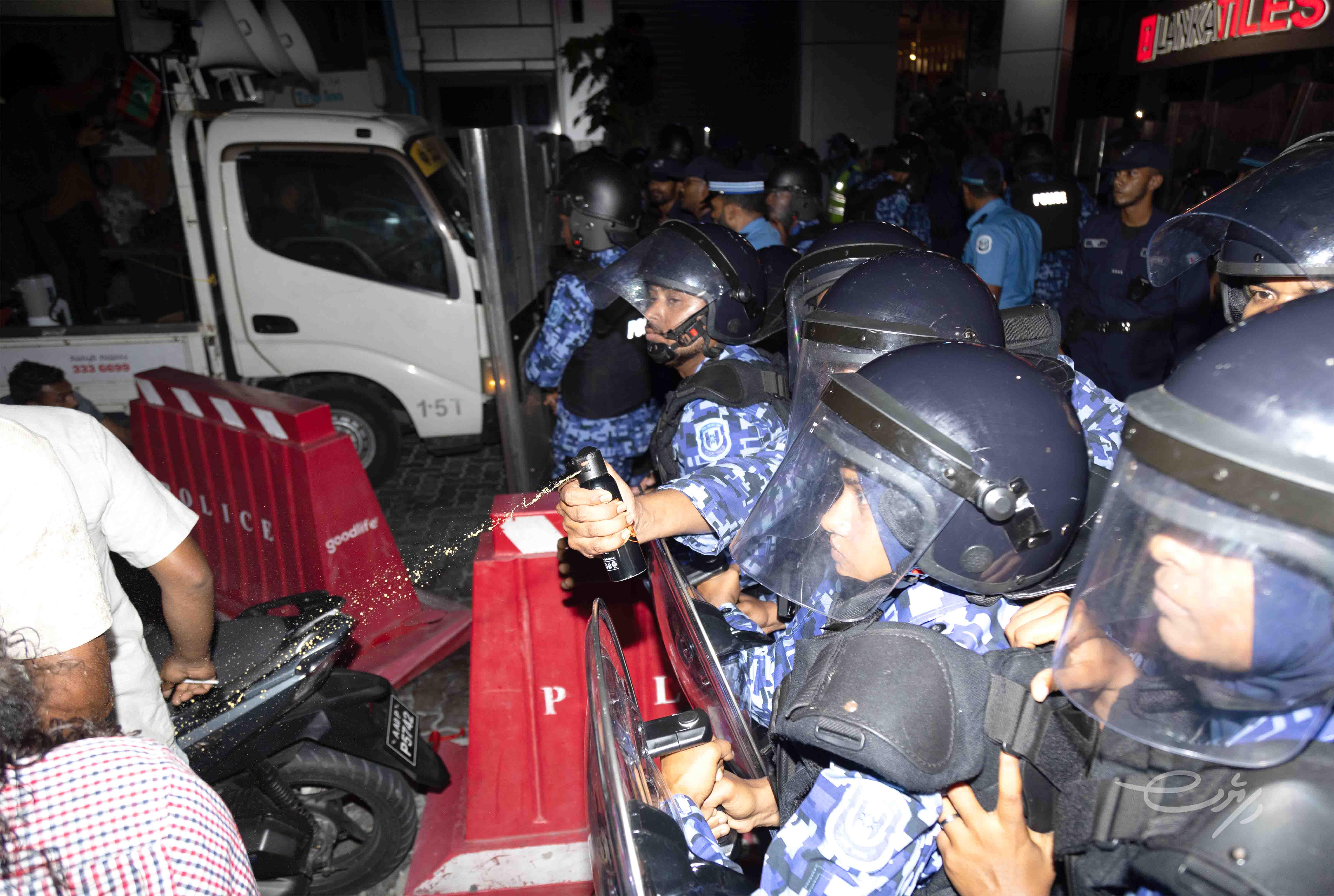 އަދި ފުލުސް އޮފިސަރުންގެ ރަސްމީ ވާޖިބު އަދާކުރުމަށް ހުރަސް އެޅުމުގެ ގޮތުން ހުއްދަ ނޫން އެއްވެސް އަމަލެއް ކޮށްފިނަމަ، އަދި ގާނޫނު ހިންގުމަށް ހުރަސް އެޅުމަށް، މާއްދީގޮތުން ހުއްޓުވައިގެން އަދި އެނޫން ގޮތަކުން ހުރަސްތަކެއް ކުރިމަތިކުރުވައިގެން ކުރާ އަމަލަކުން ހުއްޓުވަން މަސައްކަތްކުރި ނަމަވެސް، ގާނޫނީގޮތުން ފިޔަވަޅު އެޅޭނެކަންކަން ކަމަށް ވެސް ފުލުހުން ރޭ ނެރުނު ބަޔާނުގައި ބުނެފައި ވެއެވެ.