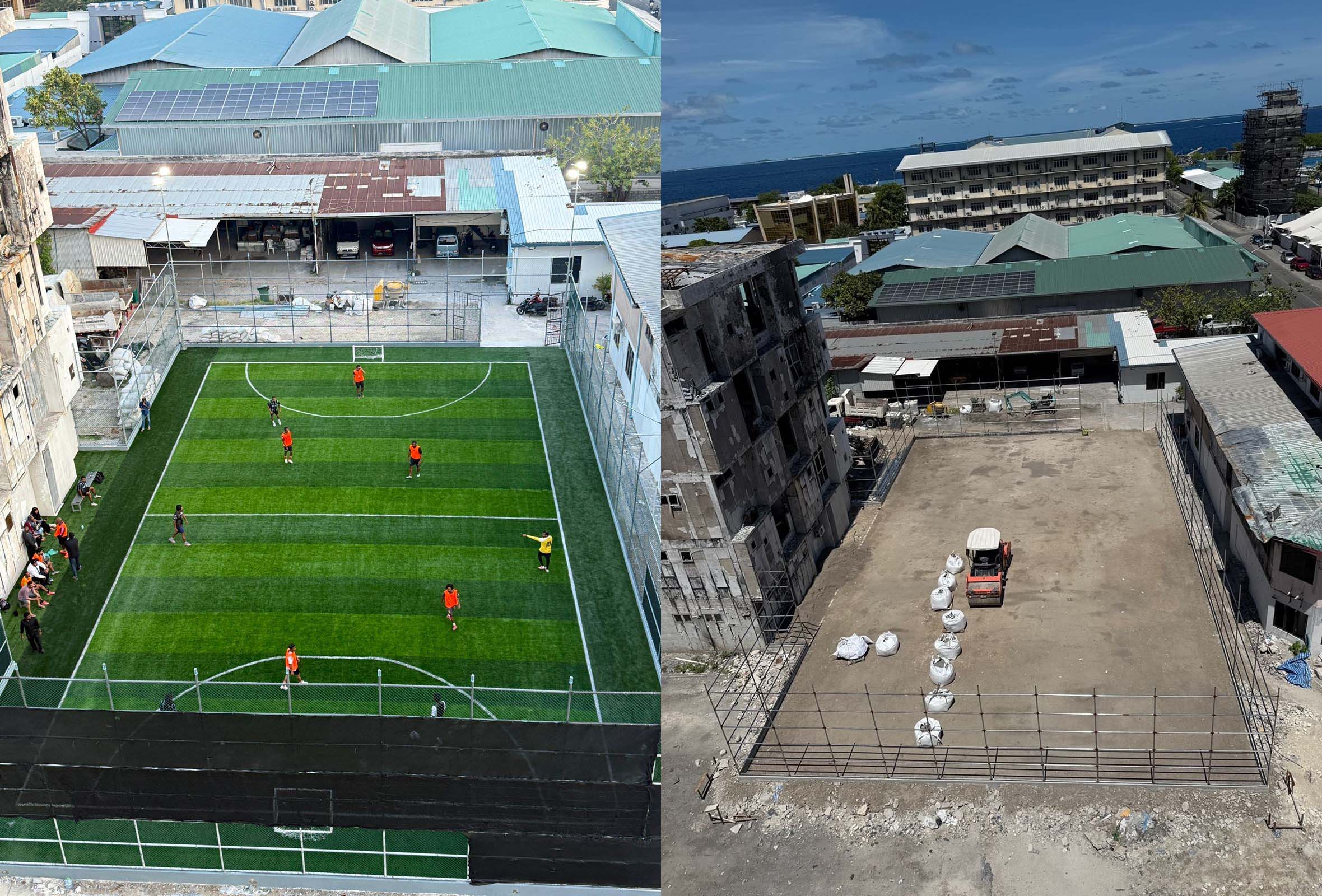 އަހަރެއް ވެގެންދިޔައިރު އެނގެން އޮތީ އަލިފާނުގެ ހާދިސާގައި ވަރަށްބޮޑަށް ގެއްލުންވި ކުރިން މިނިސްޓްރީތައް ހިންގި ދެ އިމާރާތުގެ ދޭތެރޭގައި މިހާރު ފުޓްސެލް ދަނޑެއް އަޅައިފި ކަމެވެ. އެ ދަނޑުގައި ސަރުކާރަށް ނިސްބަތްވާ ބަޔަކު ކޮންމެ ދުވަކުހެން ކަހަލަ ގޮތަކަށް ފުޓްބޯޅަ ކުޅެމުންދާ ކަމެވެ. އެ ފޮޓޯތައް މިހާރު ސޯޝަލްމީޑިއާގައި ދައުރުވަމުން އެބަ ދެއެވެ.