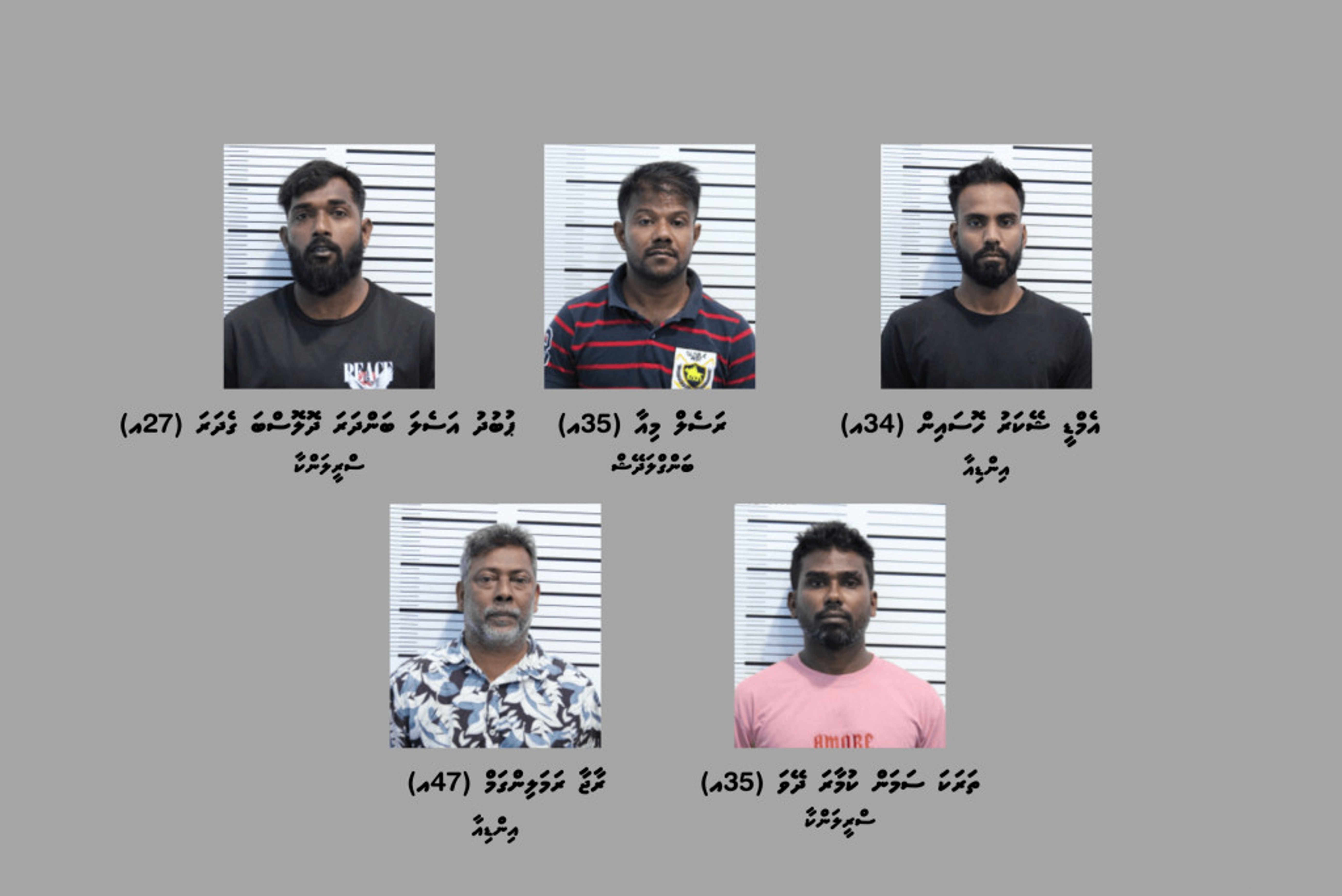 ފުލުހުން ބުނީ، މި މައްސަލައާ ގުޅިގެން ހައްޔަރުކޮށްފައިވަނީ، އސްރީލަންކާގެ އުމުރުން 27 އަހަރުގެ ޕުބުދު އަސެލަ ބަންދަރަ ދޮލޮސްބަ ގެދަރައާއި، އިންޑިއާގެ ރައްޔިތެއް ކަމަށްވާ އުމުރުން 34 އަހަރުގެ އެމްޑީ ޝޭކަރު ހޮސައިނާއި، ބަންގްލަދޭޝްގެ ރައްޔިތެއް ކަމަށްވާ އުމުރުން 35 އަހަރުގެ ރަސެލް މިއާއާއި، ސްރީލަންކާގެ އުމުރުން 35 އަހަރުގެ ތަރަކަ ސަމަން ކުމާރަ ދޭވަ، އަދި ހ. ބިންމަތީއާގެ / މާލެ، އުމުރުން 52 އަހަރުގެ މުޙައްމަދު މަނިކު ކަމަށެވެ.