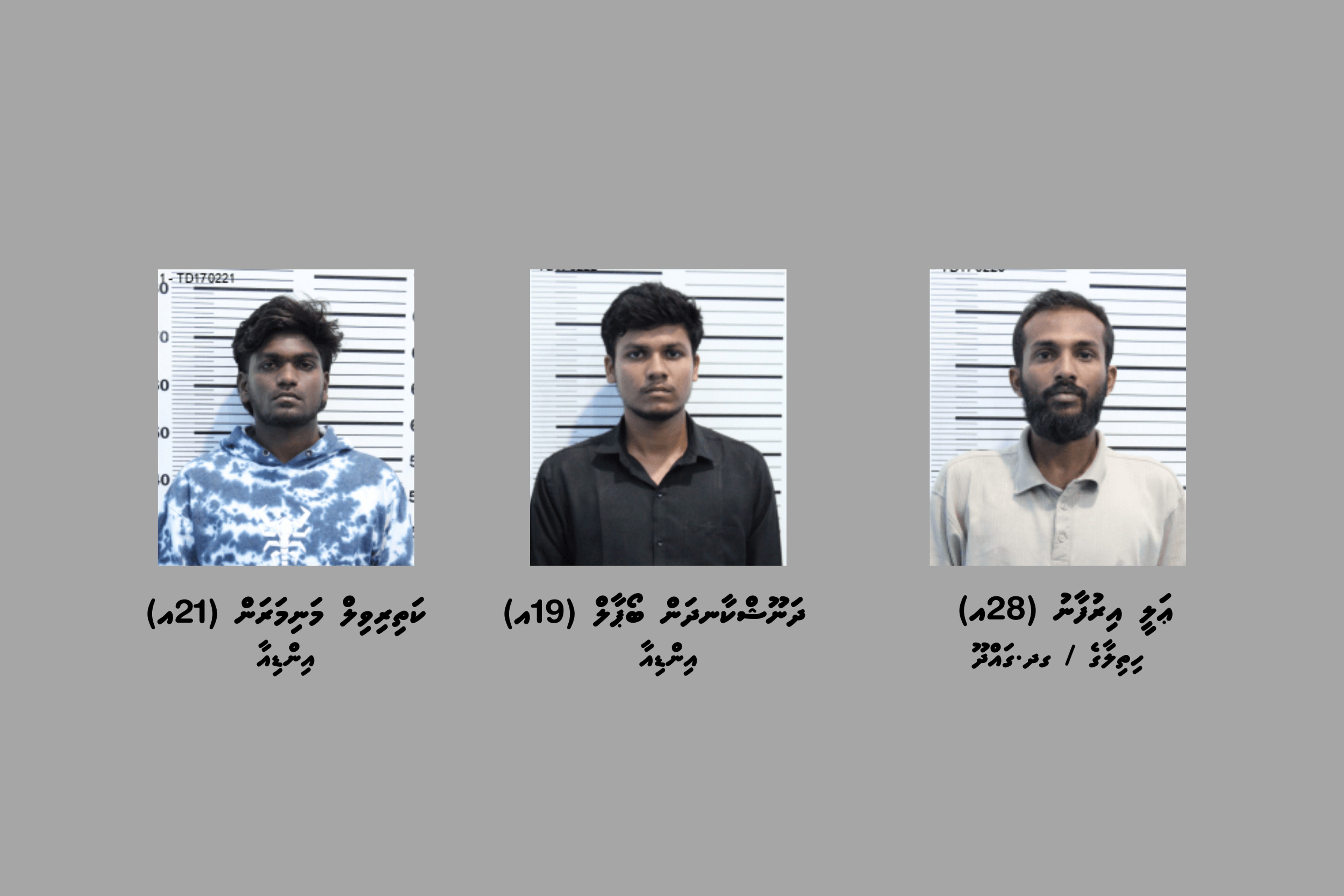 ފުލުހުންގެ އިދާރާއިން ބުނީ، މި މައްސަލައާ ގުޅިގެން ހައްޔަރުކޮށްފައި ވަނީ އަލީ އިރުފާނު (28އ) ހިތިލާގެ، ގދ. ގައްދޫ / އާއި، އިންޑިއާގެ ދެ ރައްޔިތުން ކަމަށްވާ، ދަނޫޝްކާނދަން ގޯޕާލް، (19އ) އާއި ކަތިރިވިލް މަނިމަރަން، (21އ) ކަމަށެވެ.