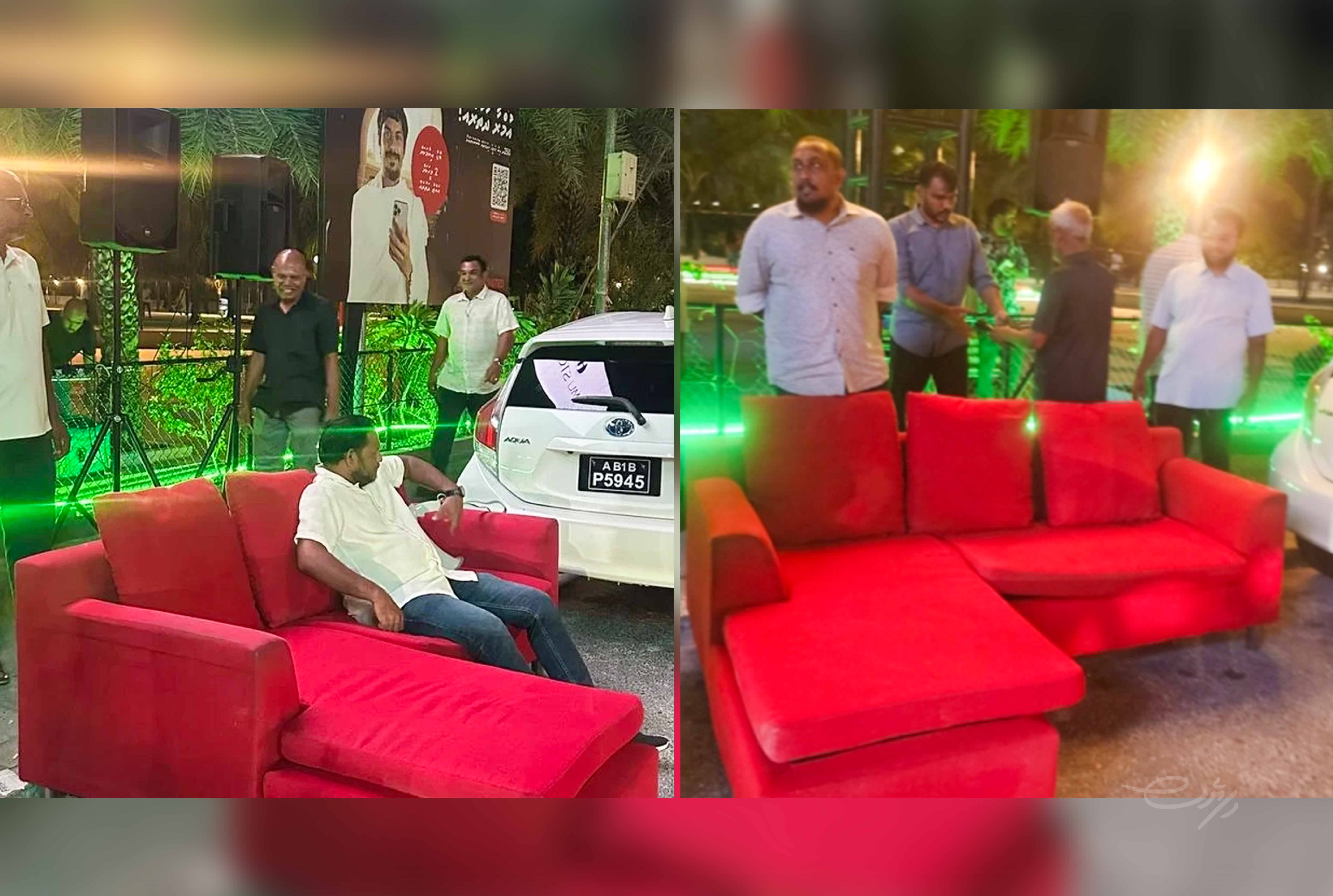 ޕީއެންއެފް މުޒާހަރާގެ ބައިވެރިން ރަތްކުލައިގެ އެލް ސޯފާއެއް ބޭނުންކޮށްފައި މިވަނީ ބެލެވޭގޮތުގައި، ރައީސް މުއިއްޒުއާ ގުޅުވައިގެން ރާއްޖޭގެ މީޑިއާ އަކުން އާންމުކޮށްފައިވާ ޑޮކިމެންޓްރީގައި ރައީސް މުއިއްޒުއަށް ރައްދުވާ ތުހުމަތުތައް ސިފަކޮށްދިނުމުގެ ގޮތުންނެވެ.